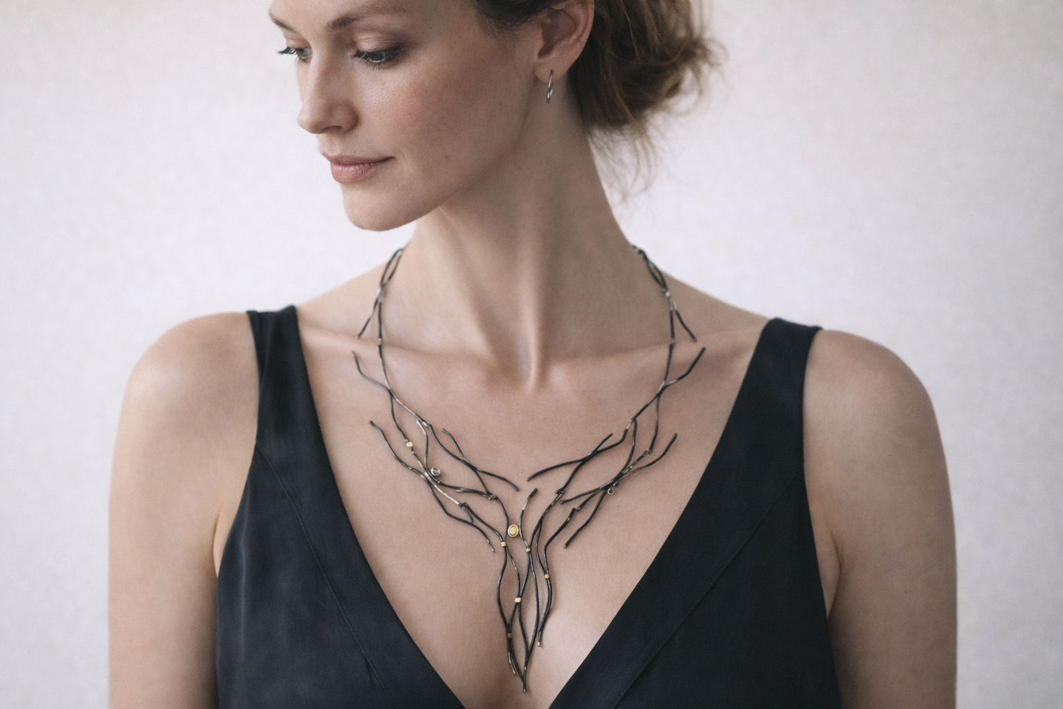 Sculptural jewelry in argentium silver,18k gold and precious stones