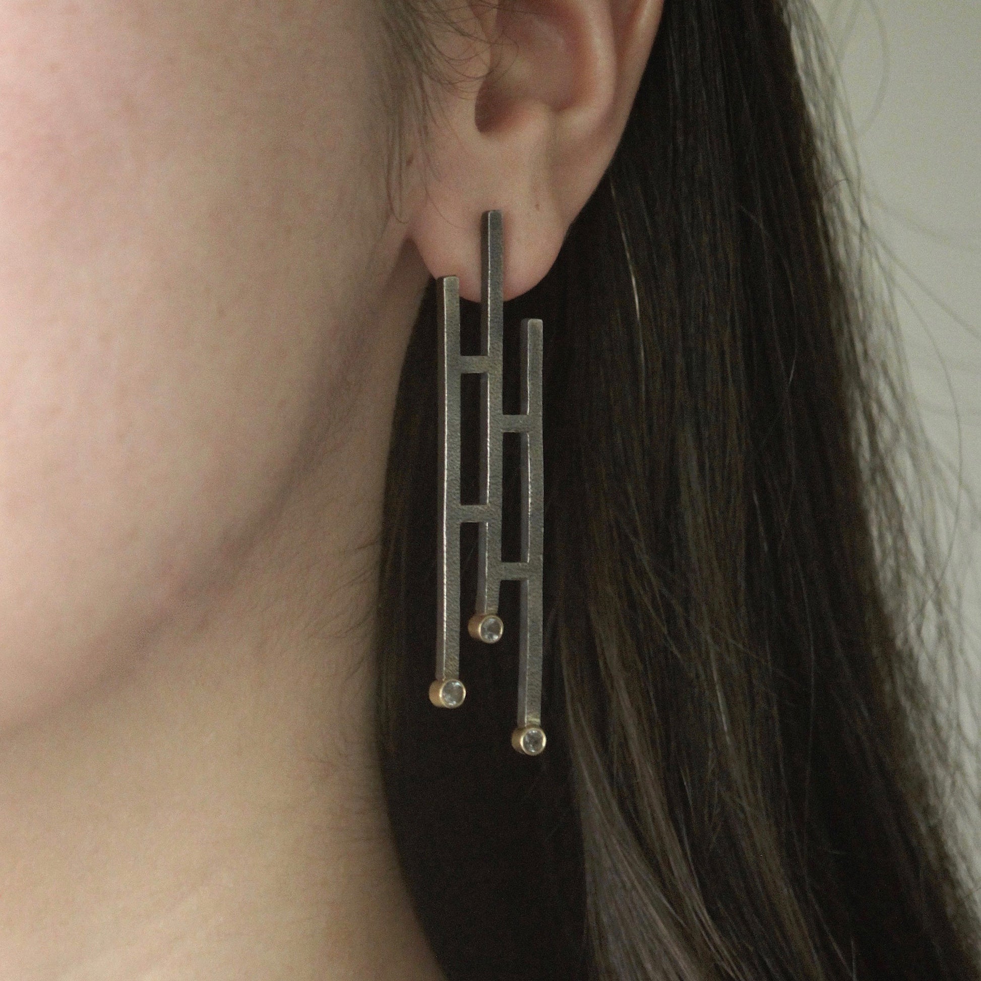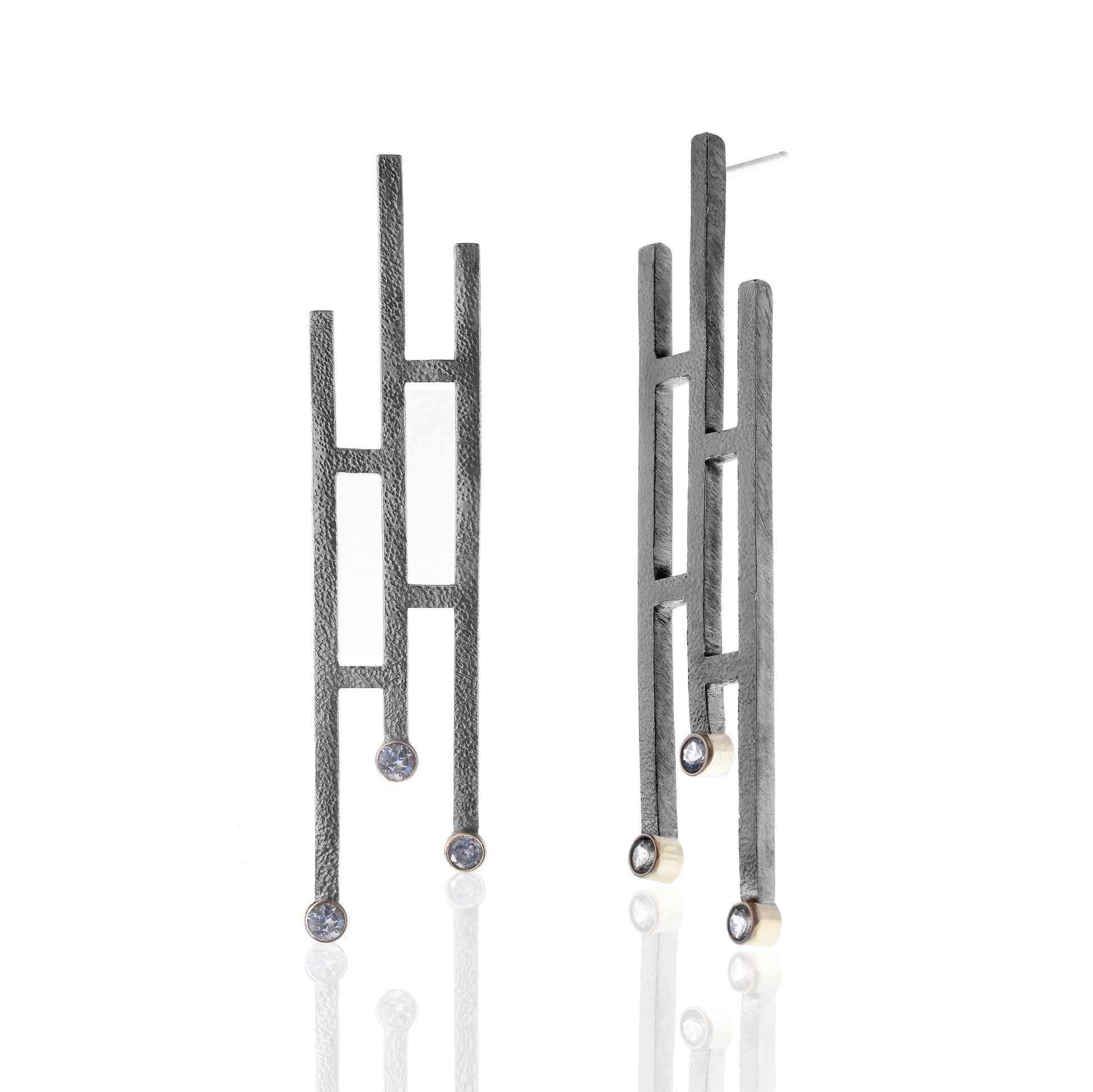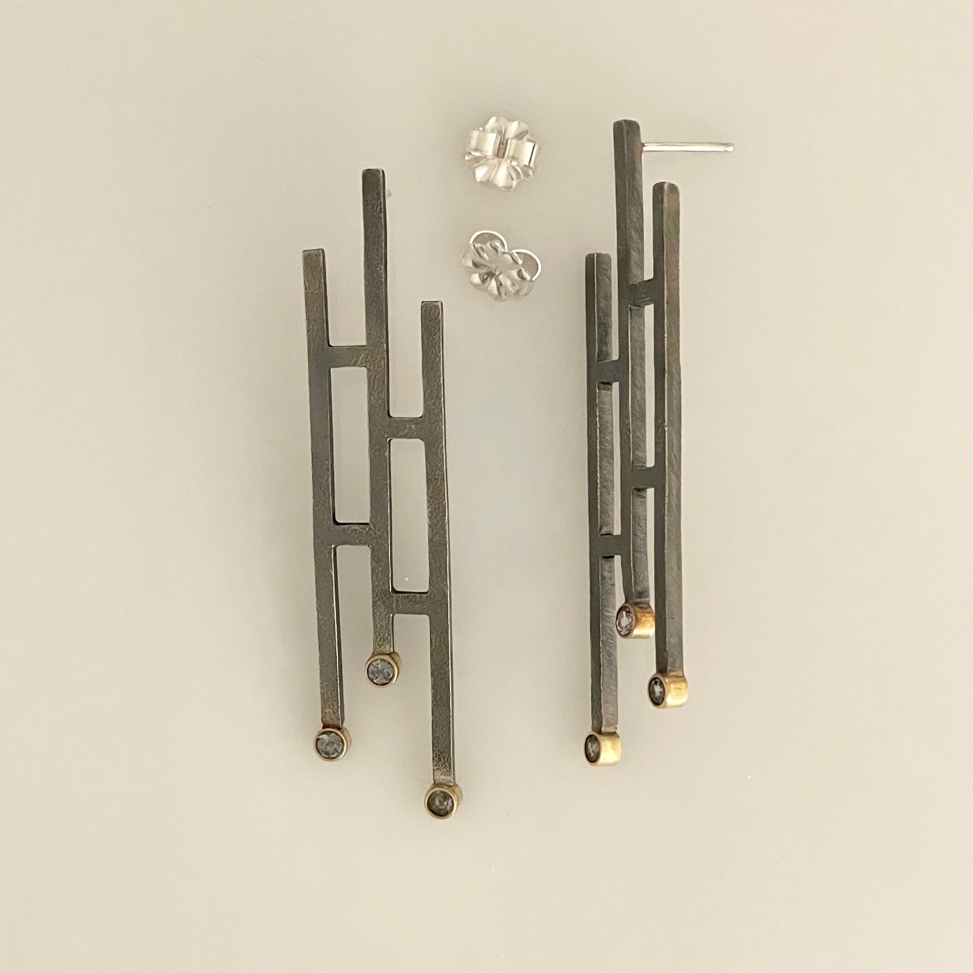 Square wire is fused and textured; gold bezels add sophistication and drama to these statement earrings.