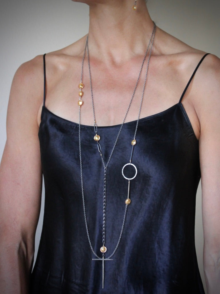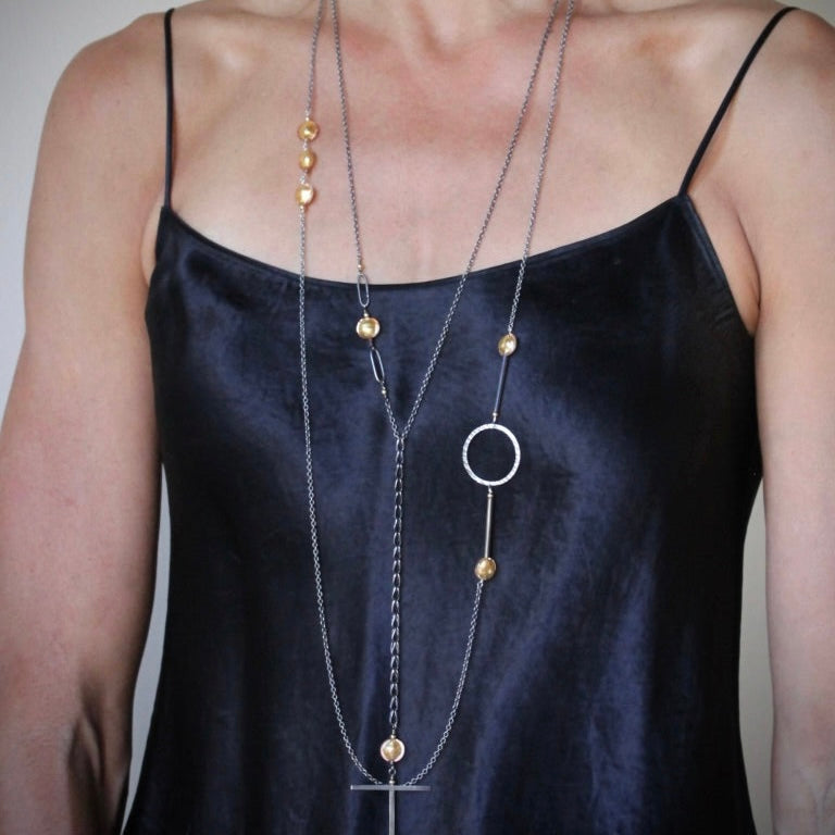 Material: Material: Stainless Steel Chain, Sterling silver Circle and Rods, 24K Gold Infused Murano Glass, 18K Gold Filled beads, 3mm ruby bead