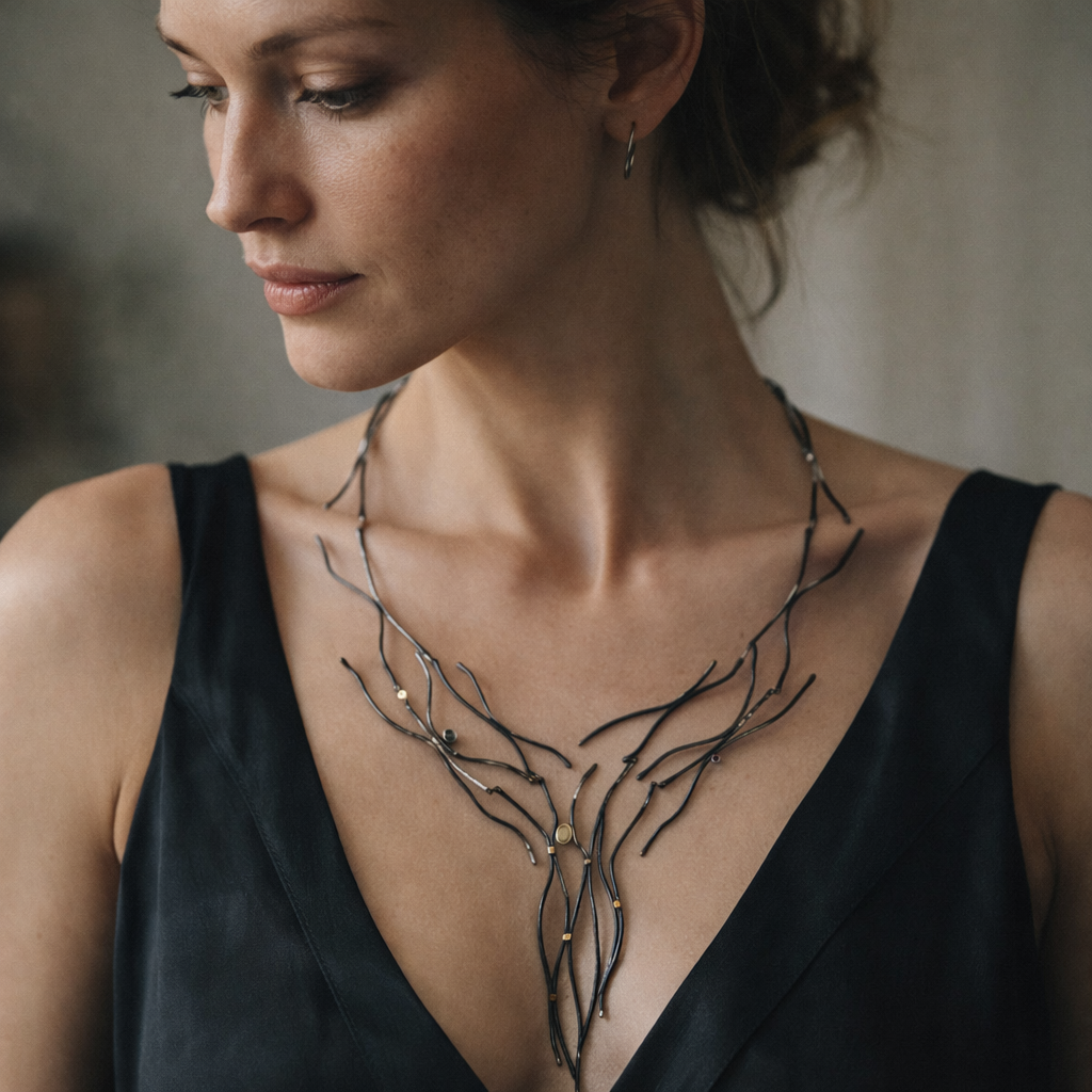 This luxury artisan necklace is handcrafted in oxidized sterling silver with sculptural, nature-inspired lines that move beautifully with the body. Accented with warm gold details and fine gemstones, it offers a refined contrast of dark and light, organic and architectural. A modern statement necklace designed to elevate both minimalist and evening looks with quiet sophistication.